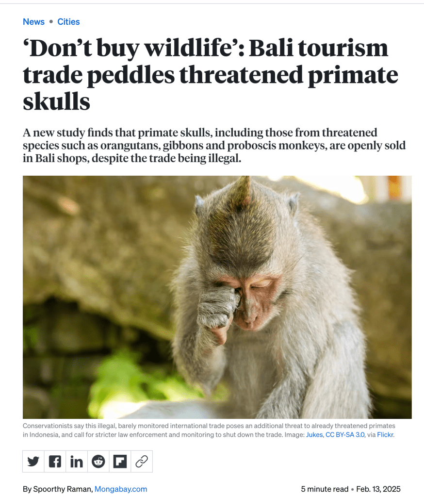 ‘Don’t buy wildlife’: Bali tourism trade peddles threatened primate skulls. EcoBusiness, February 2025